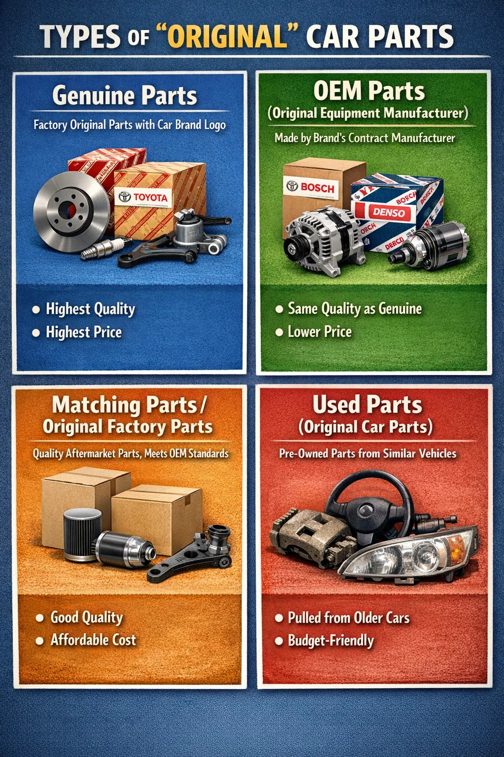 Proste wyjaśnienie: są najczystszą formą części samochodowej. Mówiąc najprościej, są części, które otrzymałeś wraz z następnymi. Części te są zwykle pakowane w logo marki samochodu (np. Toyota, Volkswagen czy Ford). Kiedy udasz się do dealera 4S w celu naprawy, zwykle wymieniają jedną część.