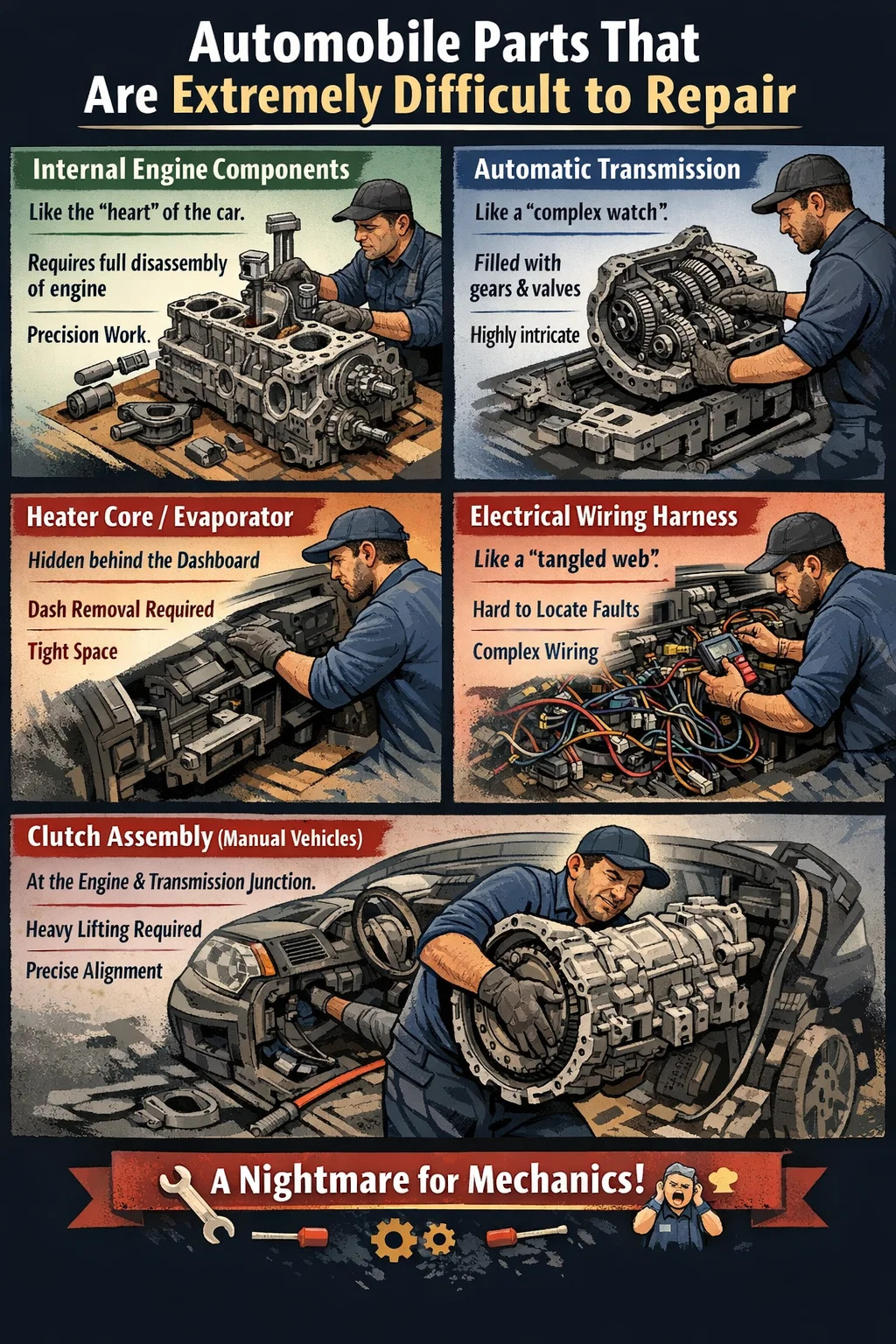 W branży naprawy samochodów, niektórzy części samochodowe są „koszmarem” do naprawy dla techników. Nie dzieje się tak dlatego, że same części są drogie, ale dlatego, że ich lokalizacja jest trudno dostępna lub ich konstrukcja jest tak skomplikowana, że naprawy są czasochłonne i pracochłonne.